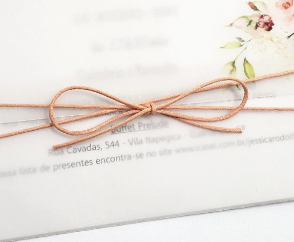 Um detalhe rústico e cheio de charme para os seus convites. O cordão encerado traz um toque artesanal e versátil, ideal para quem busca uma finalização elegante, mas com estilo descontraído e autêntico.