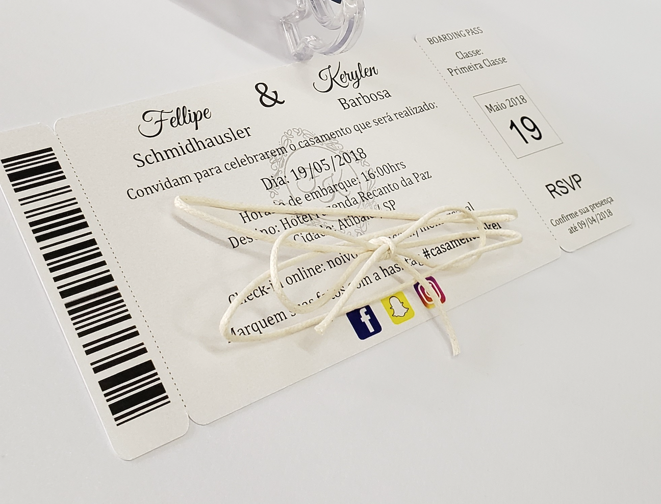 Bilhete Viagem: O convite passaporte fica ainda mais divertido e autêntico com um bilhete viagem! Se você quer surpreender, adicione ao sue convite.