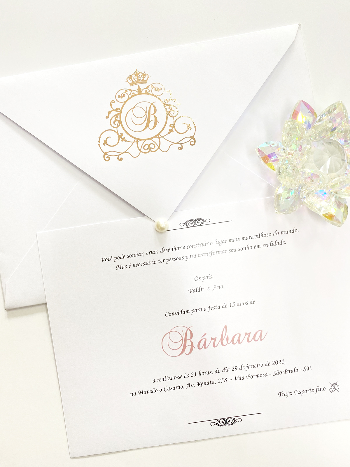 Envelope: Papel Alvura (branco fosco) com impressão em hot stamping (dourado, prata ou rose gold)